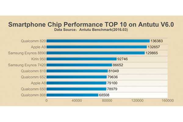 Secondo AnTuTu, quest’anno è di Qualcomm il processore più potente disponibile sul mercato. La nota applicazione per calcolare i valori benchmark (e quindi le prestazioni di calcolo) ha posizionato al primo posto Snapdragon 820 con un punteggio di 136.383, al secondo la soluzione A9 di Apple con 123.657 punti e sull’ultimo gradino del podio la CPU top di gamma Samsung ferma a 129.865 punti. Ben più distaccata di quasi 40.000 punti è la soluzione Kirin 950 montata da Huawei sugli ultimi top di gamma, davanti però a tutte le CPU della passata generazione tra cui il processore della gamma Galaxy S6 e il problematico Snapdragon 810.