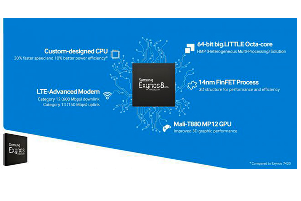 Attraverso un comunicato stampa ufficiale, Samsung ha annunciato il nuovo SoC Exynos 8 Octa 8890 riproponendosi come leader del settore anche l’anno prossimo. Solamente due giorni fa Qualcomm ha calato il sipario su Snapdragon 820, soluzione di fascia alta che andrà quindi a competere con la proposta di Samsung almeno per quel che riguarda i top di gamma della stessa compagnia coreana. Tornando all’Exynos 8890 sappiamo che è stato costruito con processo produttivo a 14 nm FinFET, lo stesso dell’attuale Exynos 7420 a bordo della gamma Galaxy S6. Piccolo, piccolissimo ma anche completo: sul chip sono stati saldati anche il modem LTE Cat 12/13 con velocità di trasmissione pari a 600 Mbps in download e 150 Mbps in upload. Sono otto i processori anima di questo SoC, personalizzati a 64-bit ARMv8 partendo dallo standard ARM Cortex-A72, che dovrebbero assicurare un 30% in più di potenza e un risparmio energetico quantificabile intorno al 10% rispetto all’attuale Exynos 7. Confermata anche l’architettura big.Little, che affiderà i compiti meno impegnativi ai restanti quattro core Cortex-A53, massima potenza invece grazie alla tecnologia Samsung Coherent Interconnect (SCI) per gestire le cache e tutti e otto i processori contemporaneamente.
