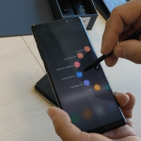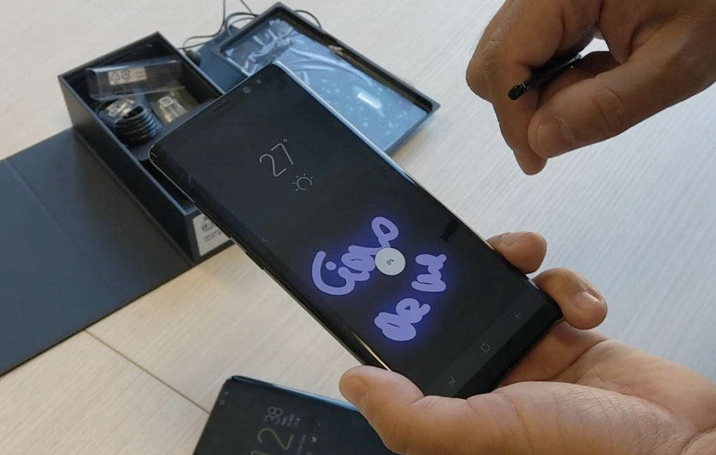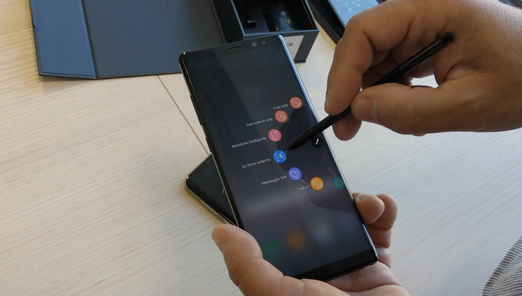 S Pen si trova nella parte inferiore destra. Se si estrae con il Note 8 in stand-by o con lo schermo spento, si attiva subito la modalità taccuino (senza sbloccare lo smartphone) che permette di prendere appunti a mano libera fino all’equivalente di 100 volte lo spazio offerto dall’Infinity Display. Non manca l’Air Command che raggruppa al lato destro (poco sotto ai pannelli Edge) i comandi disponibili: alla funzione “messaggio live” per scrivere testi interattivi da mandare ai contatti, fino alla possibilità di creare Gif animate, di selezionare zone del display e di tradurre parole e intere frasi in 71 lingue differenti. Il sistema di scrittura riconosce fino a 4.096 punti di pressione, tanto da permettere la certificazione grafometrica della firma a livello legale.