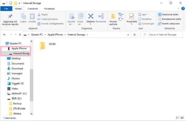C’è anche un modo semplice per completare il trasferimento trascinando direttamente sul computer. Possiamo attraversare Windows Explorer e copiare sul computer la cartella DCIM per spostare foto da iPhone a PC: