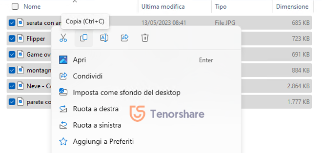 - Clicca il pulsante destro del mouse sulle foto o cartelle selezionate e scegli “Copia”.