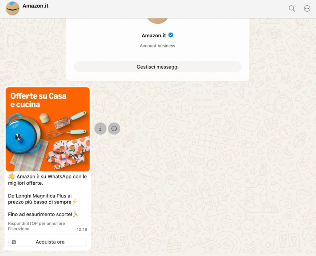 Da oggi molti utenti si sono ritrovati messaggi promozionali direttamente su WhatsApp, inviati dall’account ufficiale di Amazon Italia. Una novità che ha sorpreso diversi utenti e che rientra nelle strategie del colosso per il Black Friday 2025. Se queste notifiche risultano fastidiose, è probabile che il consenso sia stato fornito senza rendersene conto.