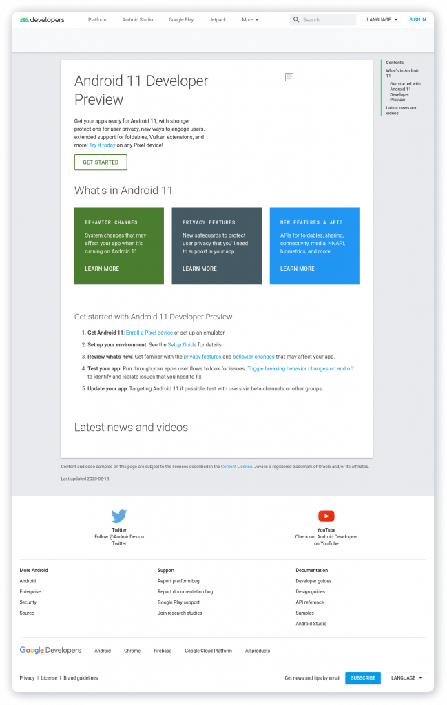 Individuata dai colleghi di Android Police, questa pagina descrive brevemente la disponibilità della prima versione di prova di Android 11, nonché i punti principali su cui si è concentrato il team di Google.