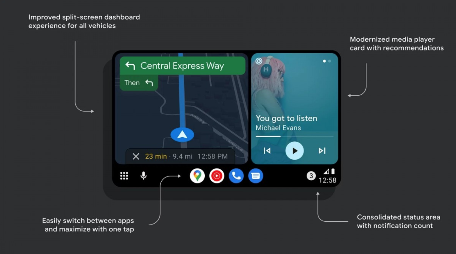 La nuova interfaccia di Android Auto ha ora un look più più pulito, con elementi e controlli dell’interfaccia utente più grandi. L’obiettivo di Google era renderla più leggibile e far sì che i controlli fossero più raggiungibili. Anche la divisione delle diverse porzioni dello schermo è ora più efficace.