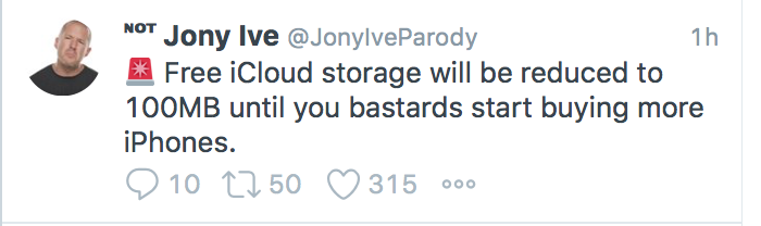 Infine, l’apoteosi: “Lo spazio storage di iCloud sarà ridotto a 100 MB finché voi bastardi non incomincerete a comprare più iPhone”