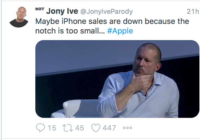 In un altro messaggio un perplesso Jony Ive si tiene il mento pensieroso e il testo recita: “Forse le vendite di iPhone stanno scendendo perché il notch è troppo piccolo…”