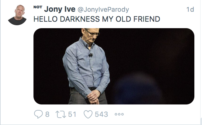 Ieri, invece, il finto Ive ha pubblicato la foto di un rassegnato Tim Cook che fa da corredo ai versi della canzone The Sound of Silence di Simon&Gerfunkel che inizia con le parole….. Hello Darkness My Old Friend…