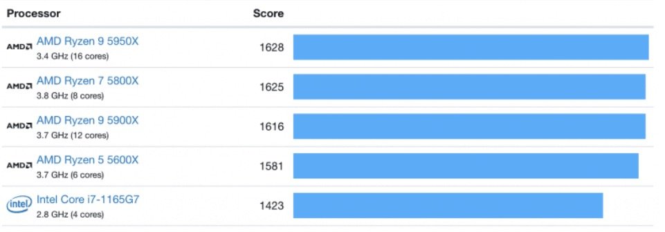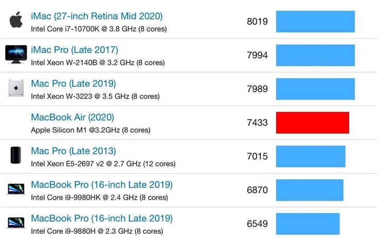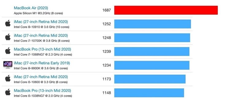 I risultati generati dal software Geekbench 5 suggeriscono un progresso significativo dell’Apple M1 rispetto ad alcuni grandi processori desktop, tra cui AMD Ryzen 9 5950X o Intel Core i9-9900K nel calcolo single-core.