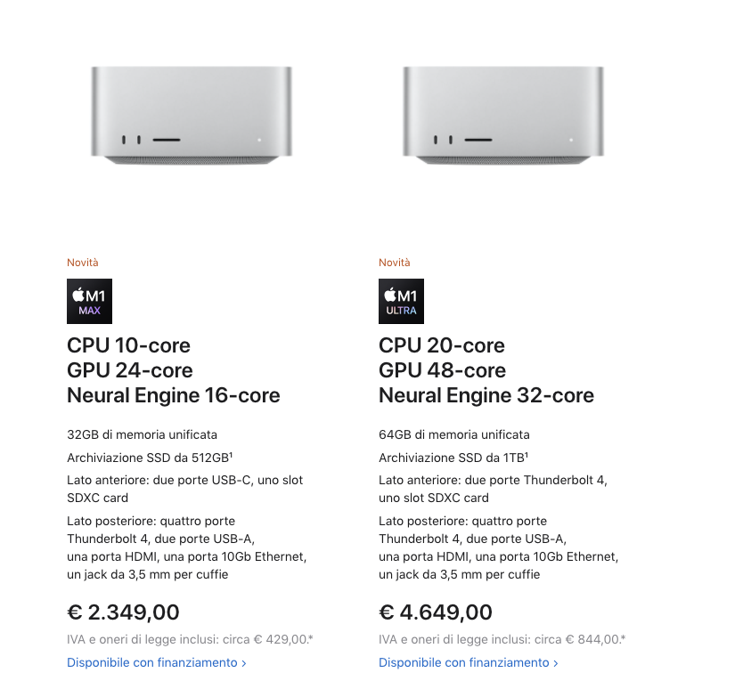 In Italia costerà 2349 euro (Apple M1 Max, 32 GB, 512 GB) e 4489 euro (Apple M1 Ultra, 64 GB e 1 TB). Esistono diverse varianti dell’M1 Ultra, con 48 o 64 core grafici. Nella sua configurazione massima si arriva fino a 9.199 euro con 128 GB di memoria unificata e 8 TB di SSD.