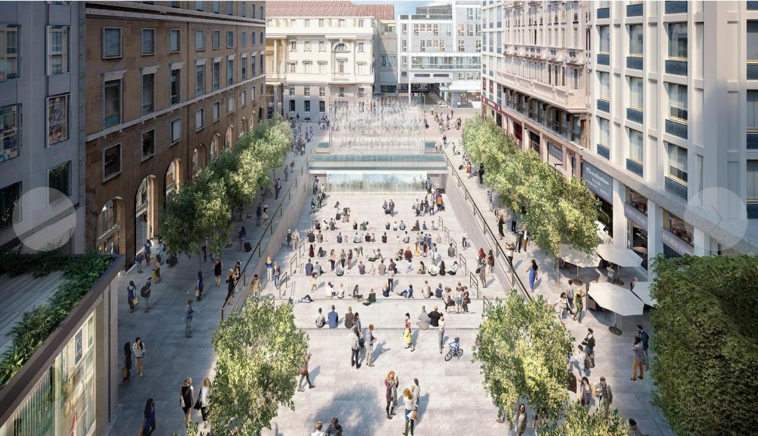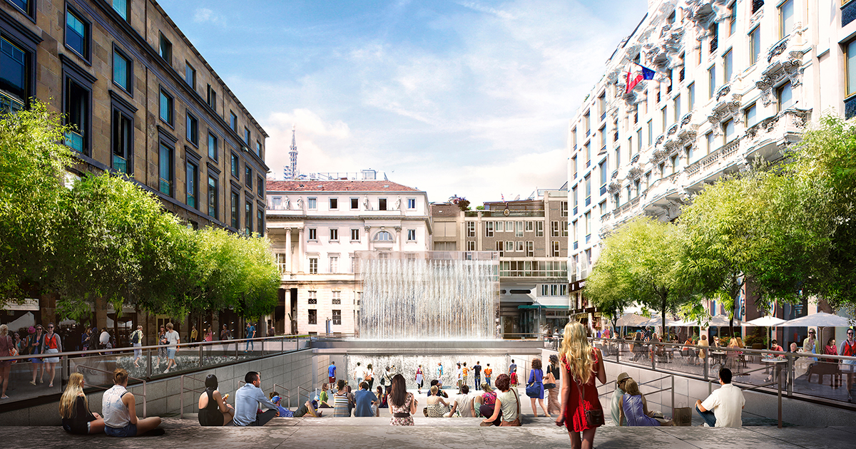 Piazza Liberty di Milano sarà protagonista del progetto che comprenderà una grande piazza pubblica pensata come un anfiteatro e uno store sottostante dal design mozzafiato composto da un cubo di vetro sul quale scorre dell’acqua.