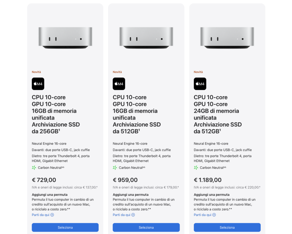 Nonostante le numerose migliorie, Apple ha deciso di mantenere il prezzo inalterato. Il nuovo Mac mini con chip M4 è disponibile a partire da 699 euro, mentre la versione M4 Pro è disponibile a partire da 1649 euro.