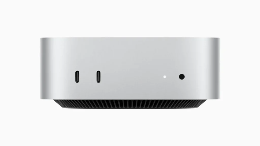 Nonostante le dimensioni ridotte, il Mac mini mantiene una buona dotazione di porte. Nella parte anteriore, troviamo un jack per cuffie da 3,5 mm e due porte USB-C con velocità fino a 10 Gbps. Sul retro, sono presenti la porta di alimentazione, una porta RJ45, una porta HDMI e tre porte USB-C a 40 Gbps.