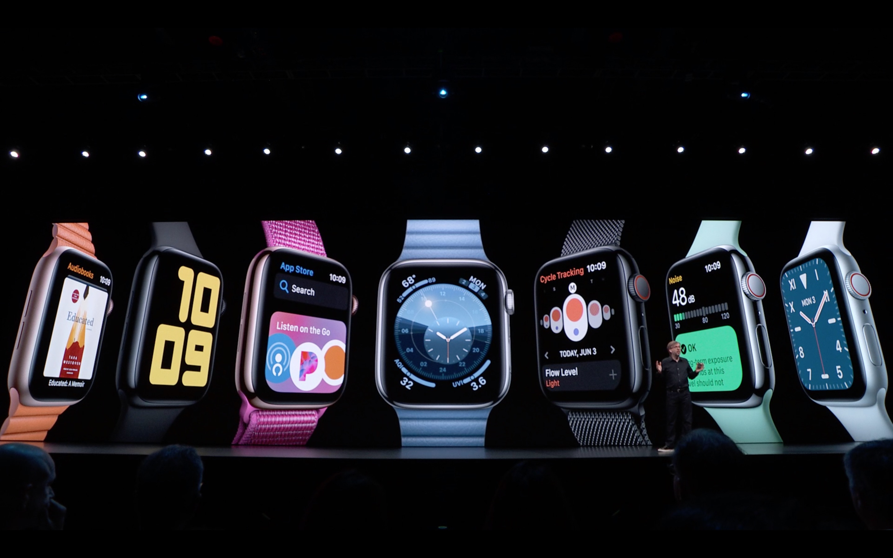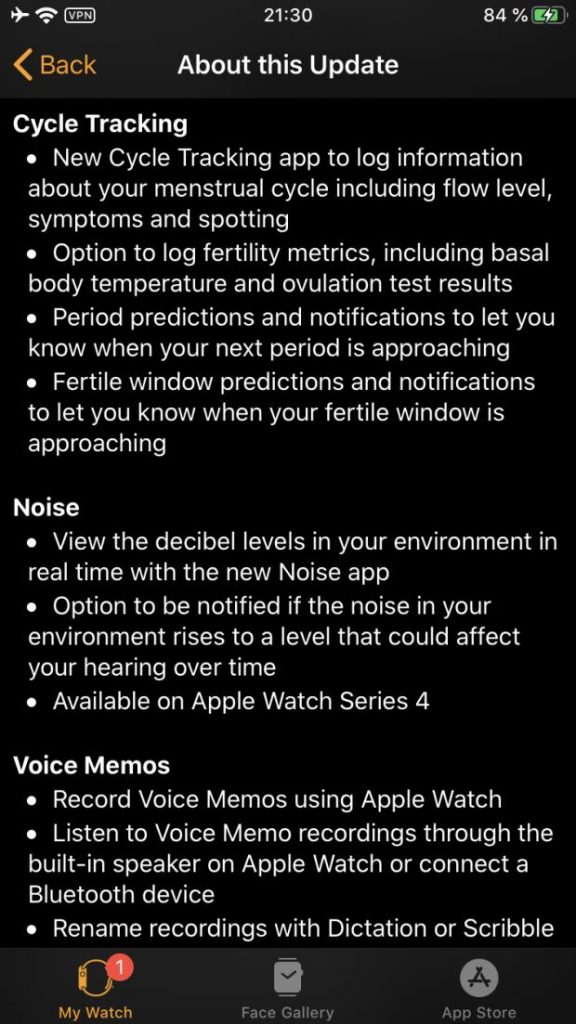 I punti salienti della versione di watchOS 6 includono la nuova app Cycle Tracking dedicate alle donne per monitorare il loro ciclo mestruale con funzionalità come previsioni e notifiche del periodo, previsioni e notifiche della finestra fertili, nonché la possibilità di registrare metriche di fertilità come la temperatura corporea basale e i risultati dei test di ovulazione.