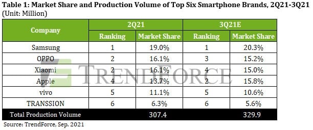 Per il secondo trimestre del 2021, TrendForce ha collocato Apple dietro Samsung, Xiaomi e Oppo nella classifica dei principali produttori di smartphone. Tuttavia, Cupertino dovrebbe riconquistare il secondo posto nel terzo trimestre, probabilmente sostenuto dal rilascio dell’iPhone 13.