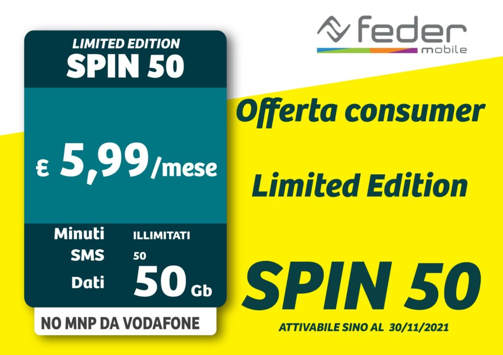 Feder Mobile rilancia presentando SPIN 50, una tariffa Limited Edition a 5,99 euro al mese che comprende 50 GB di traffico, chiamate illimitate e 50 Sms, con prezzo di acquisto scontato a 28,90 (anziché 30,90 euro), comprensivo del primo mese di traffico. La Limited Edition sarà attivabile fino al 30 Novembre da nuovo numero ed in MNP – Mobile Number Portability (esclusa Vodafone).