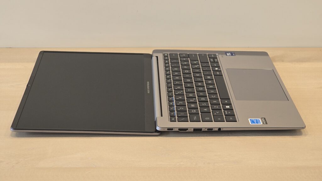 La scocca in alluminio conferisce all’ExpertBook P5 una struttura solida e resistente, conforme agli standard militari US MIL-STD 810H. Con un peso di 1,27 kg, il notebook si lascia trasportare facilmente e risulta ideale per i professionisti in continuo movimento. Il design è piacevole. un perfetto mix di eleganza e minimalismo. Utilie la possibilità di aprire lo schermo fino a 180 gradi.