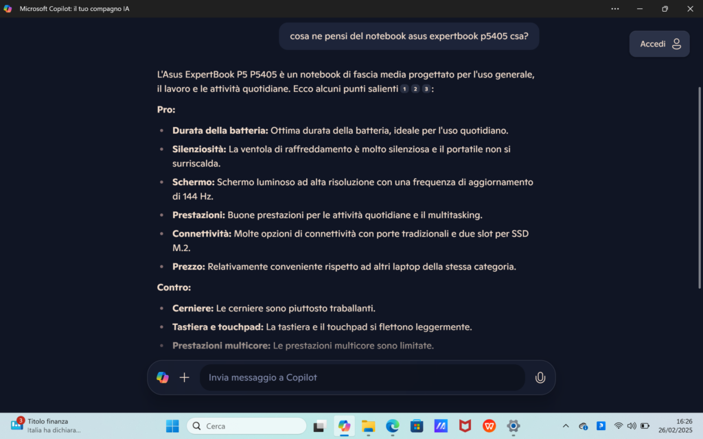 L’Asus ExpertBook P5 (P5405CSA) è un notebook davvero piacevole, si propone come una soluzione ottimale per una moltitudine di figure professionali, alla ricerca di una macchina potente, sicura e dotato di evolute funzionalità AI. Le carte vincenti risiedono in un design piacevole, peso contenuto, ottime prestazioni complessive e un notevole livello di sicurezza. Il prezzo di 1.559 euro è decisamente adeguato alle performance della macchina e, online, non è difficile spuntare anche prezzi più contenuti.