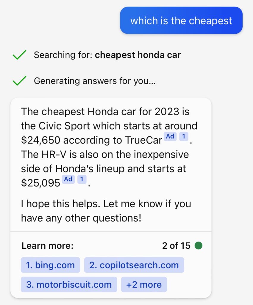 Come funzioneranno le pubblicità nel nuovo Bing? In effetti non sarà un sistema completamente nuovo, ma ricorda quello già previsto nei classici motori di ricerca traslato all’intelligenza artificiale. Occasionalmente, nelle risposte del browser, oltre a comparire la risposta dell’IA potrà essere presentato anche un risultato sponsorizzato. Questo sarà contrassegnato dalla dicitura AD per essere facilmente riconoscibile.