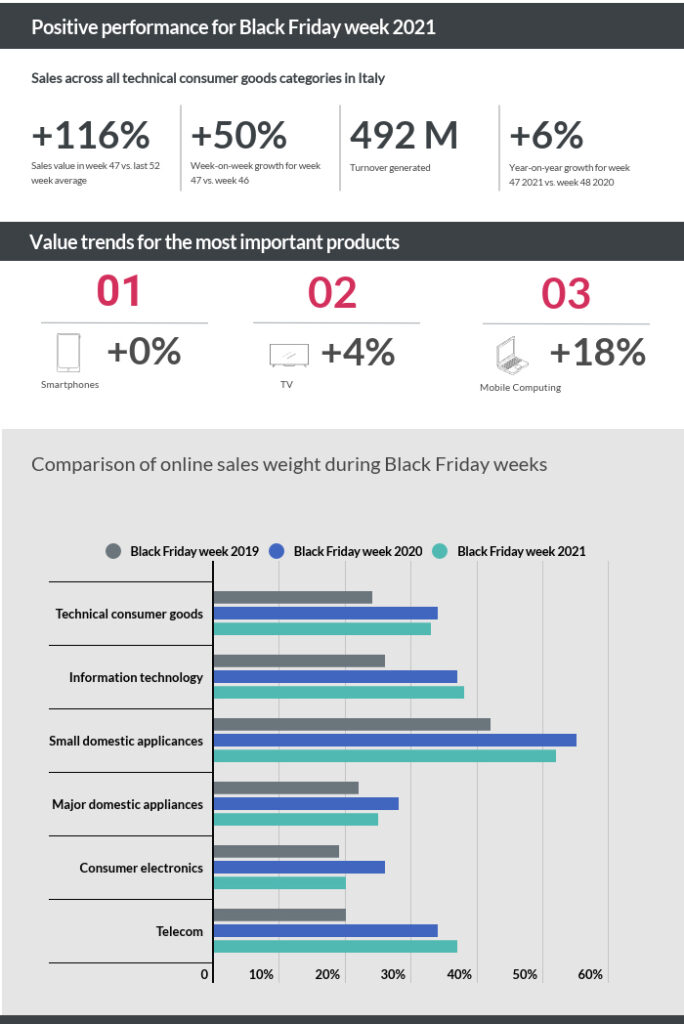 Per questo perimetro di prodotti, durante la settimana del Black Friday 2021 è stato generato un controvalore pari a 492 milioni di euro.