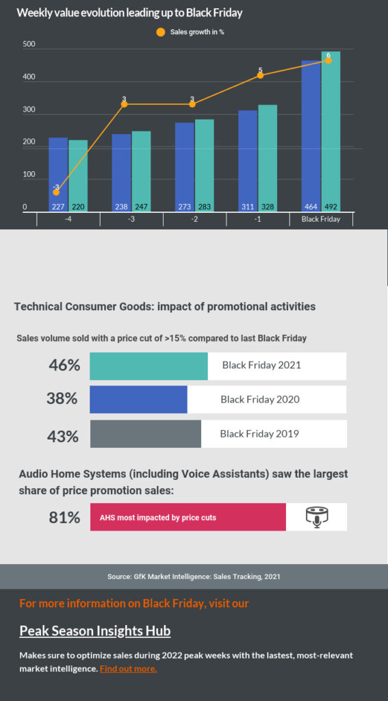 Come avvenuto negli ultimi anni, molti retailer ed e-tailer hanno giocato d’anticipo e le promozioni sono iniziate fin dall’inizio di Novembre con importanti campagne pubblicitarie a sostegno. Questo ha portato a un trend positivo nelle settimane precedenti a quella del Black Friday ma la domanda di Tecnologia ha sostenuto la performance della settimana più importante dell’anno.