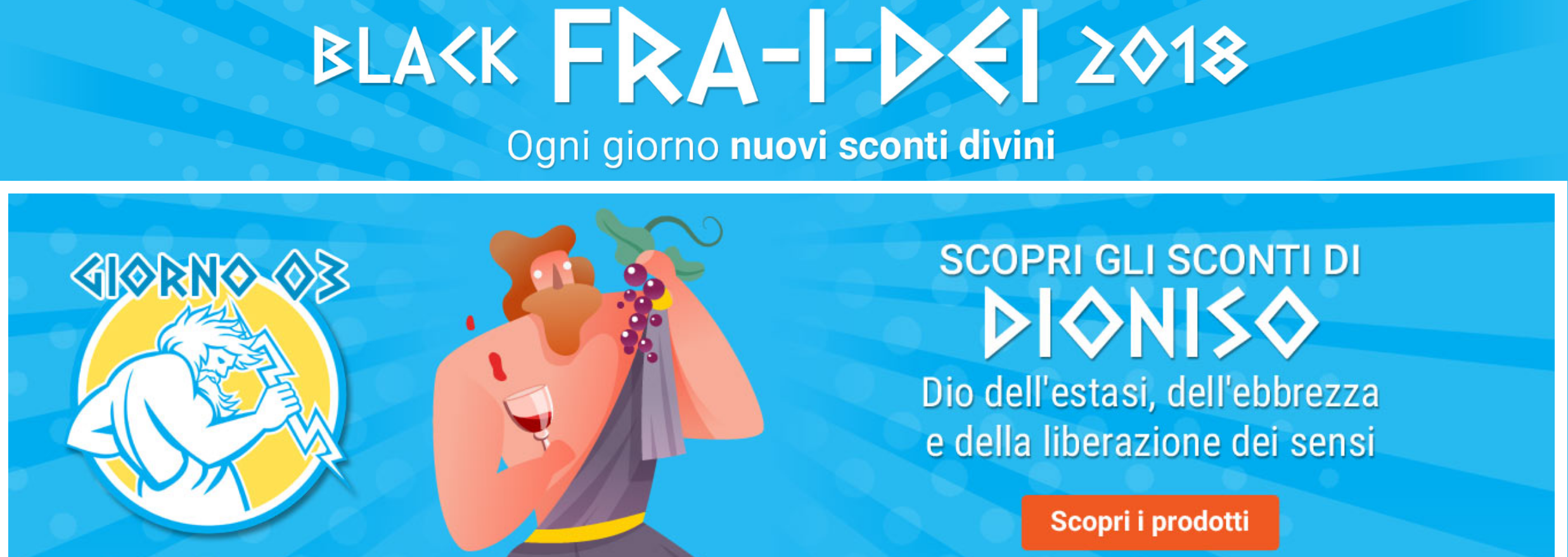 Fino a domenica 25 novembre, Monclick.it dedica una pagina a Fra-I-Dei (https://www.monclick.it/black-friday-2018) nella quale, ogni giorno, verrà svelata una nuova divinità a cui saranno abbinati prodotti con forti sconti di tutte le categorie merceologiche.