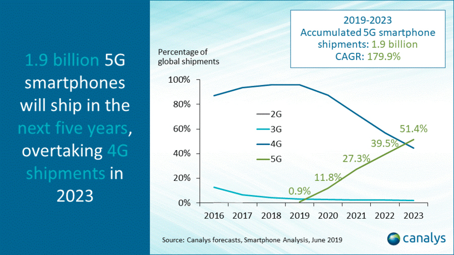 Al Mobile World Congress 2019 di Shanghai, Canalys ha pubbliato le sue ultime previsioni a livello mondiale riguardanti gli smartphone 5G. L’istituto di aanalisi prevede che i telefoni compatibili con le reti 5G raggiungeranno circa 800 milioni di unità nel 2023, una cifra pari al 51,4% di tutte le spedizioni di smartphone. In tale data, dunque, il 5G effettuerà il sorpasso commerciale sul 4G, esattamente cinque anni dopo il lancio commerciale globale delle reti di quinta generazione.