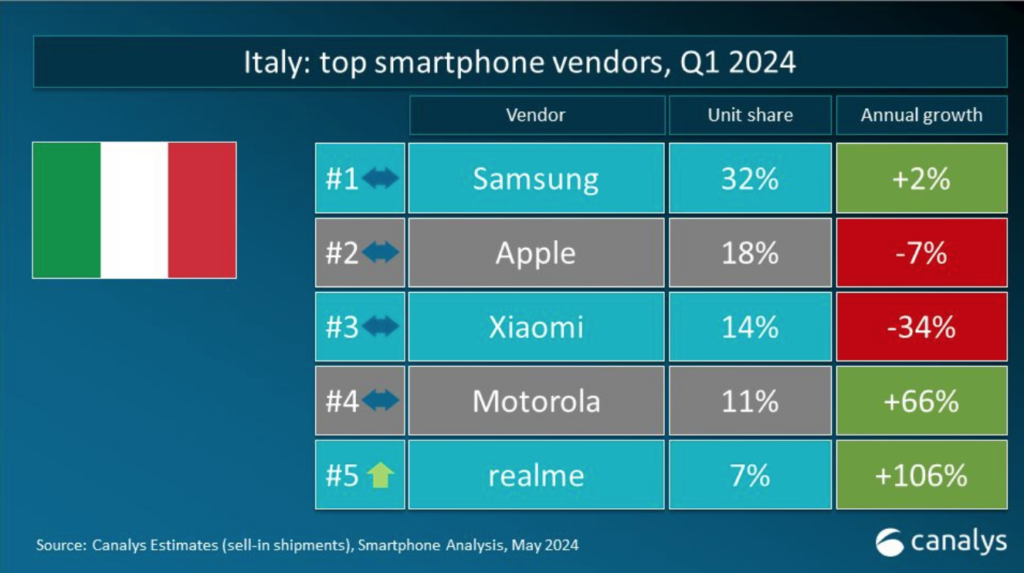 L’istituto di ricerca Canalys ha diffuso i dati relativi alle vendite di smartphone in Italia nel primo trimestre del 2024. Si tratta dei cosiddetti dati di sell-in che conteggiano le unità distribuite dai vendor attraverso il loro distributori verso i punti vendita e non i dati reali di venduto.