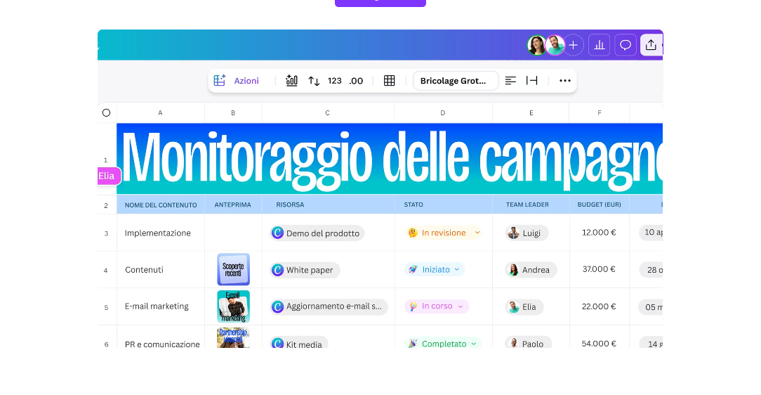 Inoltre, i fogli sono pensati per il lavoro collaborativo: è possibile commentare, condividere, e lavorare a più mani, esattamente come su qualsiasi altro contenuto Canva.