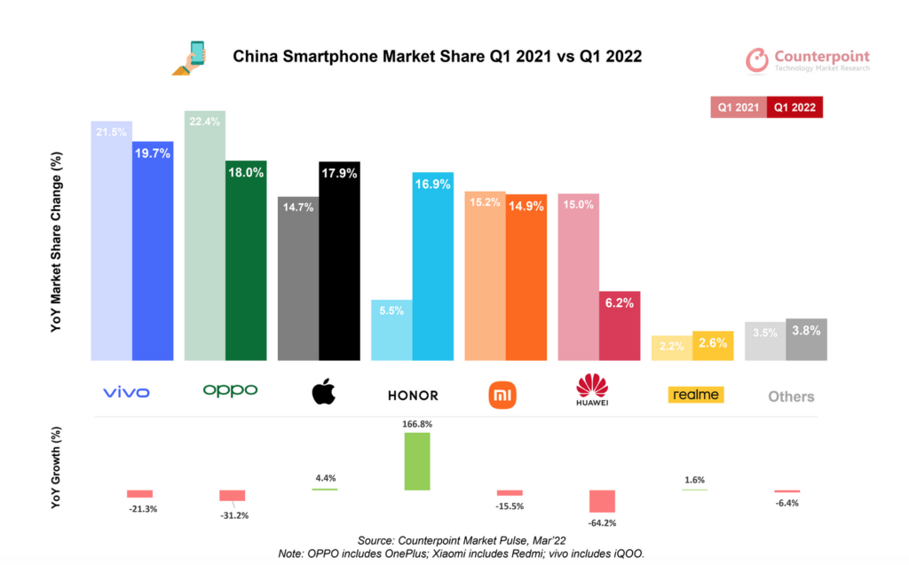Nei primi tre mesi del 2022 in Cina sono stati spediti 74,2 milioni di smartphone, un numero che rappresenta un calo del 14% rispetto allo stesso periodo dell’anno scorso (dati Counterpoint Research).