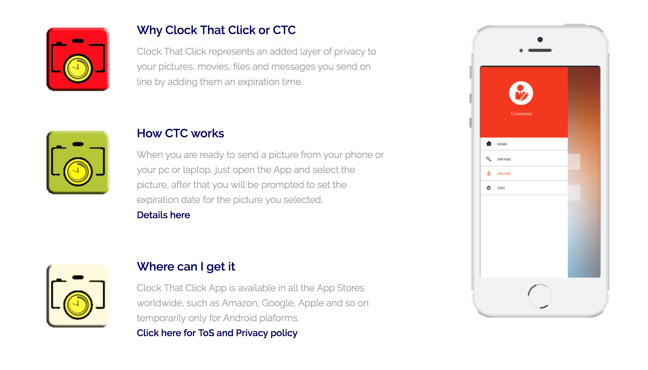 Clock that Click è stata ideata da CWS per arginare fenomeni di cyber bullismo tramite internet e ripristinare la privacy che con il massiccio invio di foto e video privati sta andando a scomparire. CTC App è alla sua prima versione per Android e supporta i seguenti file: Jpeg, Gif, Png, avi, mp4. La versione per Apple arriverà nel corso dei prossimi mesi.