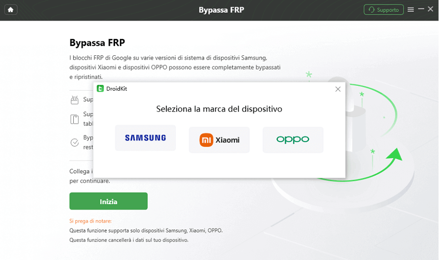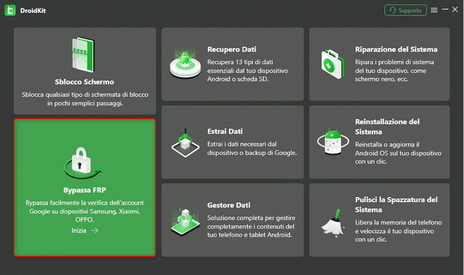 Passo 1. Scarica Droidkit gratuitamente, esegui il programma dopo l’installazione e seleziona Bypass FRP.