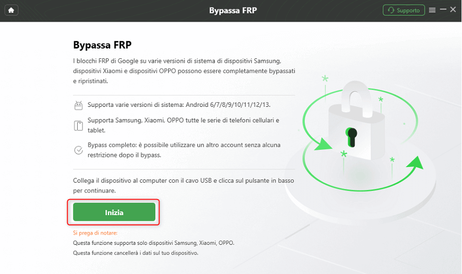 - Rimuovi il blocco FRP su più dispositivi Android: rimuovi la verifica dell’account Google sui dispositivi Samsung, Xiaomi, Redmi, POCO o OPPO.