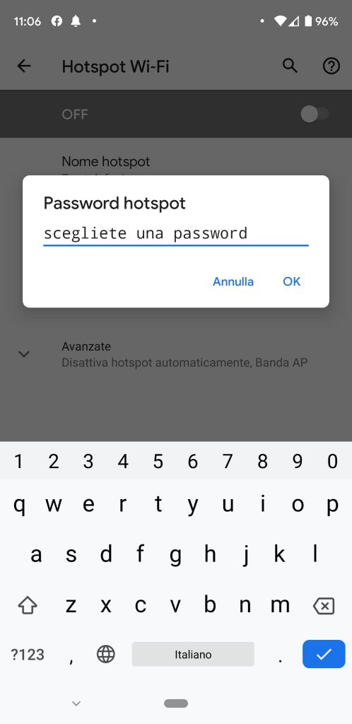 A questo punto vi mancano solo due passaggi. Il primo è quello di memorizzare (o scrivere su un foglietto) la parola che trovate appena sotto “Nome hotspot“. Si tratta in realtà del vostro modello di telefono. La seconda cosa da fare è cliccare su “password hotspot” scrivere una qualsiasi password e cliccare su “OK” . Memorizzate la password: vi servirà per collegarvi alla rete Wi-Fi che avete appena creato!