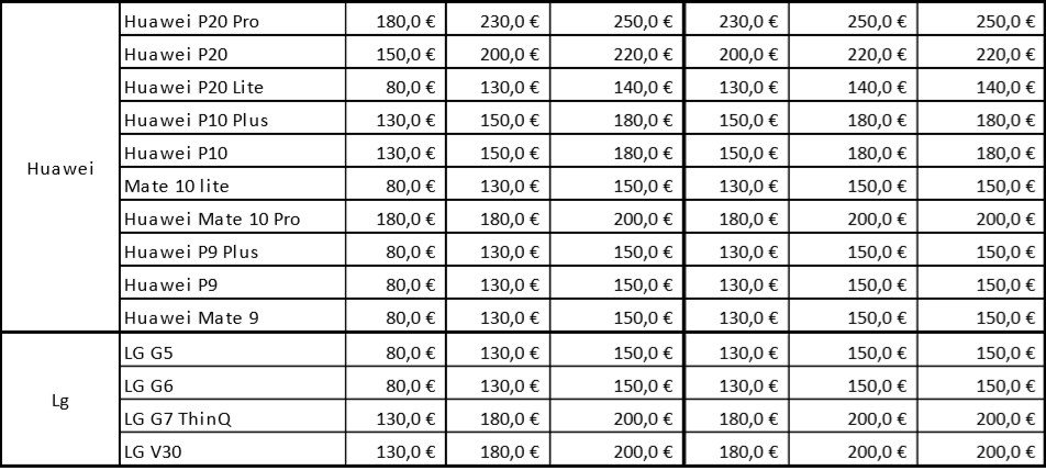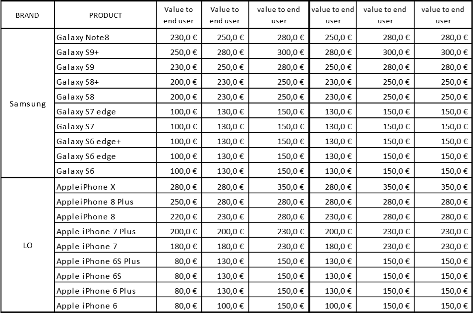 Se hai un vecchio cellulare Galaxy, LG, Apple, Huawei ecco una tabella di sintesi dimostrativa dello sconto che potrai avere.