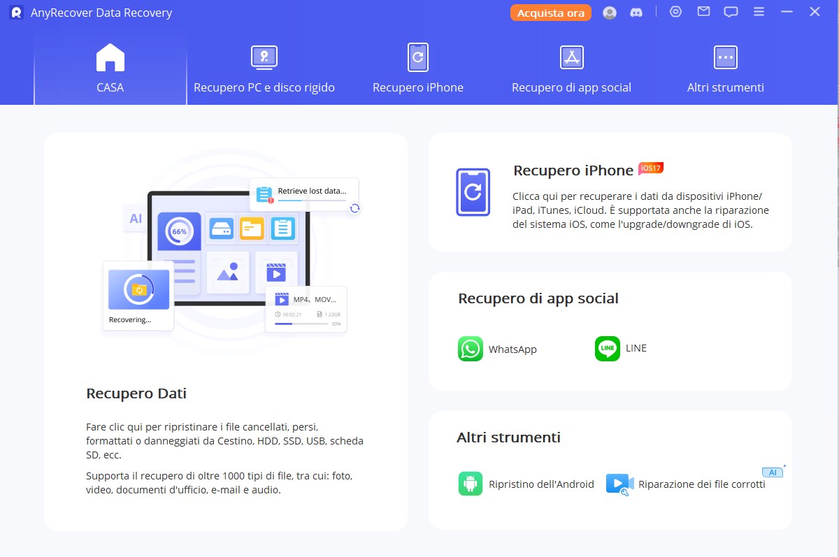 Per recuperare file rapidamente e in modo efficace con un’alta percentuale di successo, il miglior modo è scegliere uno specialista nel recupero dati per aiutarvi. Con un’interfaccia utente intuitiva, potenti capacità di recupero dei dati e una percentuale di successo del 98%, AnyRecover vi consente di ripristinare tutti i file cancellati dall’hard disk, indipendentemente dal modo in cui li avete persi, che sia per cancellazione accidentale, formattazione, effetti di virus, ecc.