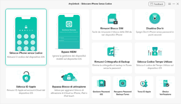 Quando l’iPhone è bloccato, dopo aver provato tutti i possibili passcode, se non riesci ancora a sbloccare il telefono, uno strumento di sblocco per iPhone autentico può aiutarti. AnyUnlock è uno strumento unico in grado di sbloccare vari tipi di passcode per iPhone: passcode a 4 o 6 cifre, Face ID, Touch ID; può proteggere le informazioni interne del tuo telefono e fornirti il programma di soluzione più efficace e veloce.