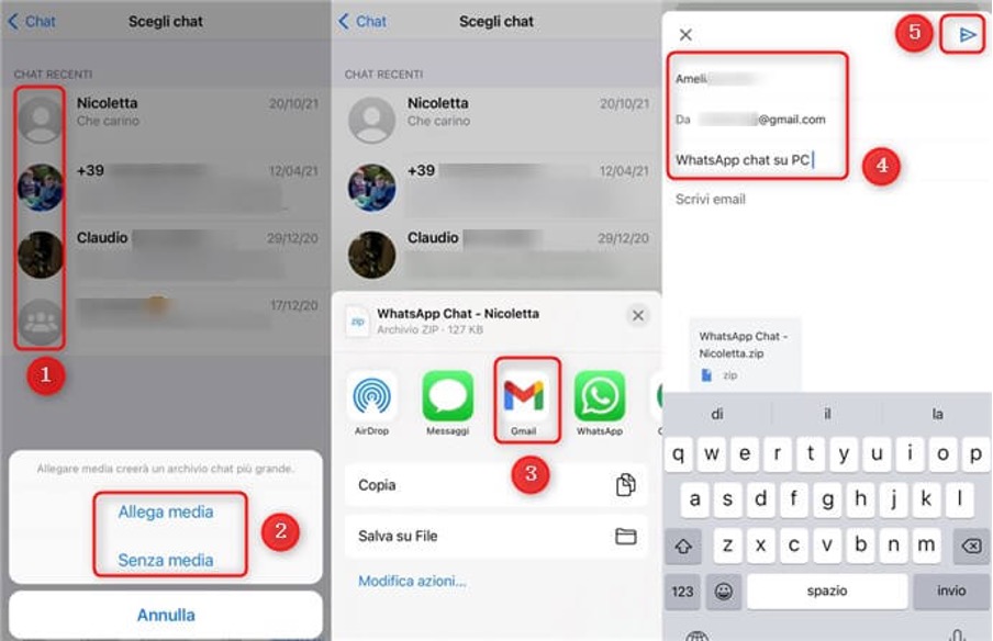 Seleziona l’e-mail a cui vuoi inviare la conversazione, inserisci l’indirizzo e-mail e premi “Invia” > Vai sul tuo PC per accedere alla tua email > scarica e decomprimi il file .zip allegato.