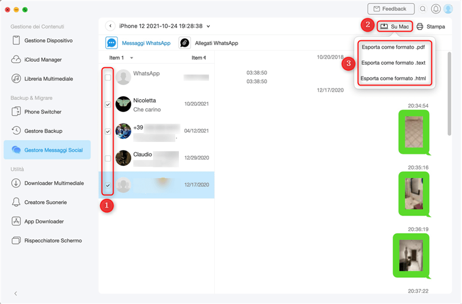 Passo 4. Seleziona la chat di WhatsApp che desideri salvare > Clicca Su PC/Mac > scegli il formato. Una volta terminato, puoi visualizzarli sul tuo computer.