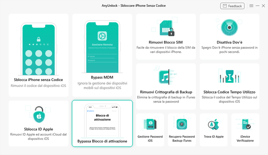 Passo 1. Scarica e installa AnyUnlock sul tuo computer. Avvia AnyUnlock e scegli Bypassa Blocco di attivazione.