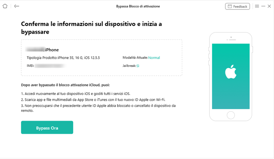 Passo 3. Segui le istruzioni sullo schermo per eseguire il jailbreak del tuo iPhone. Una volta completato, fai clic su Bypassa ora.