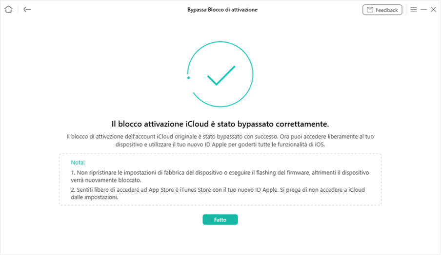 Passo 4. Attendi pazientemente. Al termine, il sistema ti informerà che il blocco di attivazione di iCloud è stato rimosso con successo. Dopo aver fatto clic su Fatto, puoi reimpostare l’account iCloud.