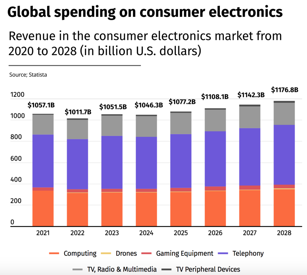 Le proiezioni di mercato non così ottimistiche per il 2024 rappresentano un nuovo ostacolo per il settore dell’elettronica di consumo, spingendolo ancora più lontano dai tassi di crescita pre-pandemia e da quelli osservati nel primo anno di lockdown. Secondo un sondaggio di Statista, quest’anno le entrate dovrebbero diminuire di 5,3 miliardi di dollari, ovvero dello 0,5%, e la maggior parte di questo calo interesserà dalle vendite di smartphone, il segmento più grande del mercato.