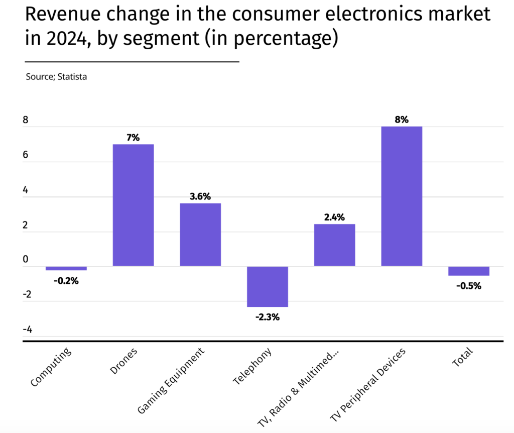 Secondo i dati presentati da Stocklytics.com, la spesa globale per l’elettronica di consumo dovrebbe diminuire di 5,3 miliardi di dollari nel 2024.
