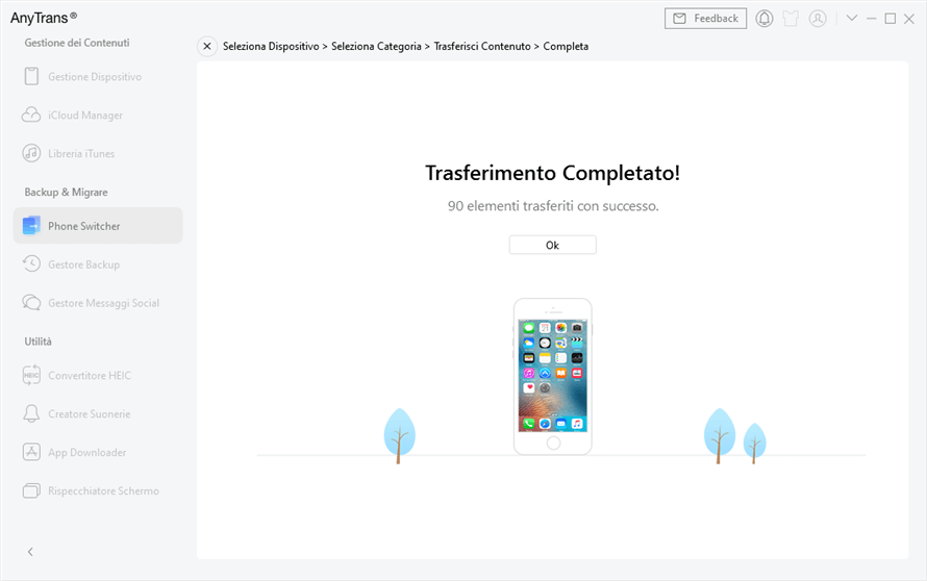 Step 3. Fare clic sul pulsante Continua. Una volta completato il processo di trasferimento, vedrai l’interfaccia “Trasferimento completato”. Per tornare all’interfaccia Phone Switcher, fare clic sul pulsante OK.