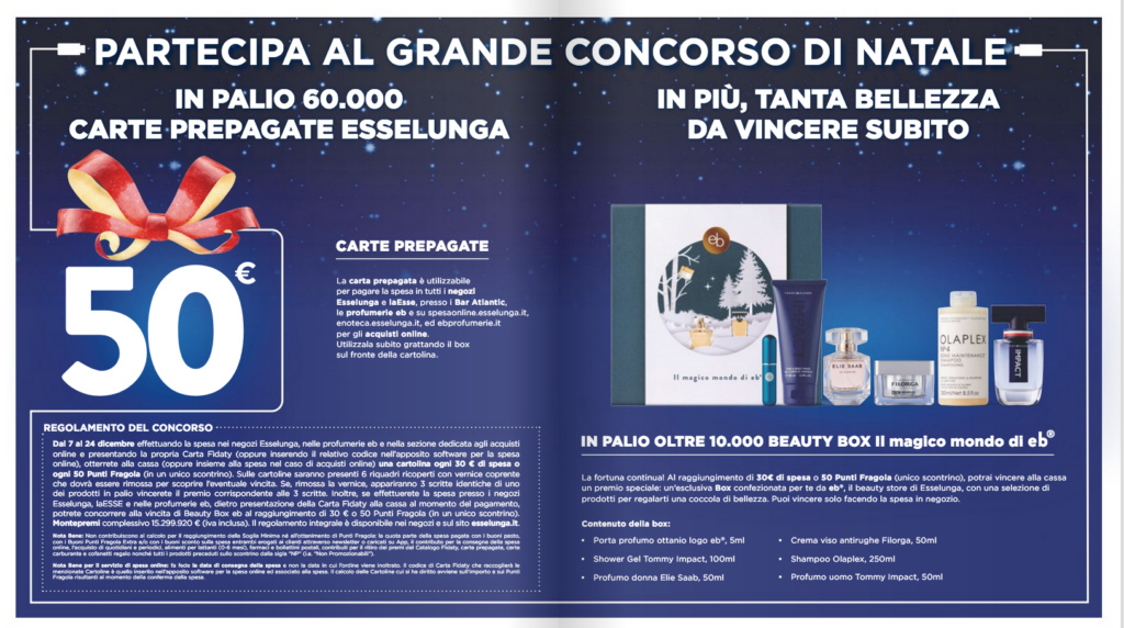 Dal 7 al 24 dicembre, effettuando la spesa nei negozi Esselunga, nelle profumerie eb e nella sezione dedicata agli acquistionline e presentando la Carta Fìdaty, per ogni 30 euro di spesa o 50 Punti Fragola (in un unico scontrino) si riceverà una cartolina del tipo “gratta e vinci”.