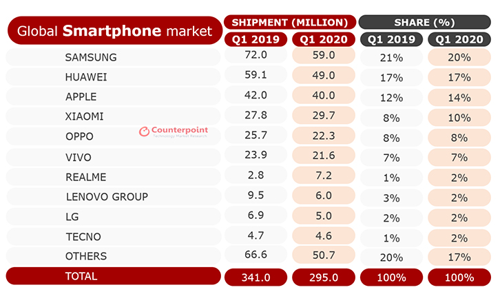 Samsung rimane il più grande produttore di smartphone al mondo, ma la sua produzione nel primo trimestre ha subito un calo del 18% anno su anno. Per il secondo trimestre, Counterpoint prevede un declino ancora più accentuato.