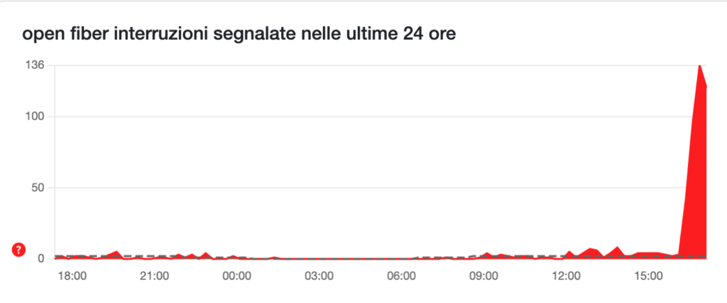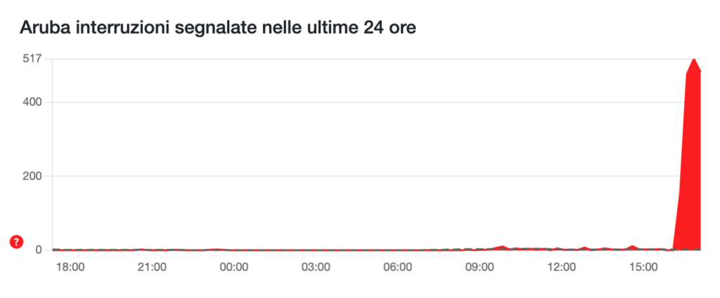 Nelle ultime ore Aruba e Open Fiber stanno registrando problemi tecnici diffusi, con un’impennata delle segnalazioni di disservizio in diverse aree del Paese. I grafici relativi alle ultime 24 ore mostrano un quadro piuttosto chiaro: dopo una lunga fase di normalità, nel tardo pomeriggio si è verificato un brusco aumento delle interruzioni segnalate dagli utenti.