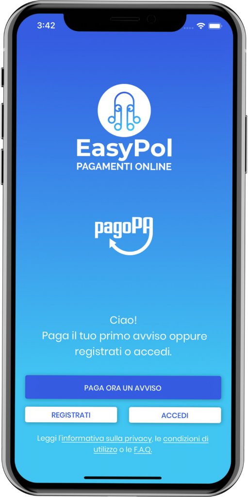 Nasce da questa considerazione l’idea di EasyPol, una mobile app capace di unire in modo facile e veloce due strumenti indispensabili per il pagamento istantaneo di avvisi PagoPA. In qualsiasi momento e da qualsiasi luogo, anche senza registrazione, tramite carte di credito, carte di debito e carte prepagate.