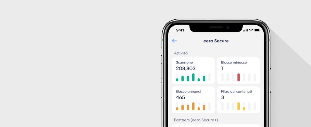 Massima protezione. Eero rende sicura la connessione di casa con costanti aggiornamenti di sicurezza per navigare in totale tranquillità. In aggiunta, è possibile aggiungere eero Secure+ in grado di offrire una protezione maggiore grazie alle tre applicazioni di sicurezza più esclusive ed efficienti: 1Password, per la gestione della password, Malwarebytes, per la protezione dai malware, ed Encrypt.me, per la VPN di tutti i dispositivi.