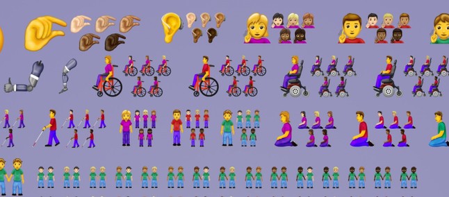 Il pacchetto Emoji 12.0 di Unicode Consortium si concentra su nuove emoji che illustrano le disabilità umane, come un orecchio umano che indossa un apparecchio acustico, una sedia a rotelle manuale, una sedia a rotelle motorizzata ed emoji maschili e femminili che significano disabilità uditive, comunicando con il linguaggio dei segni, un maschio e una femmina con un bastone, un maschio e una femmina su una sedia a rotelle e un cane guida.